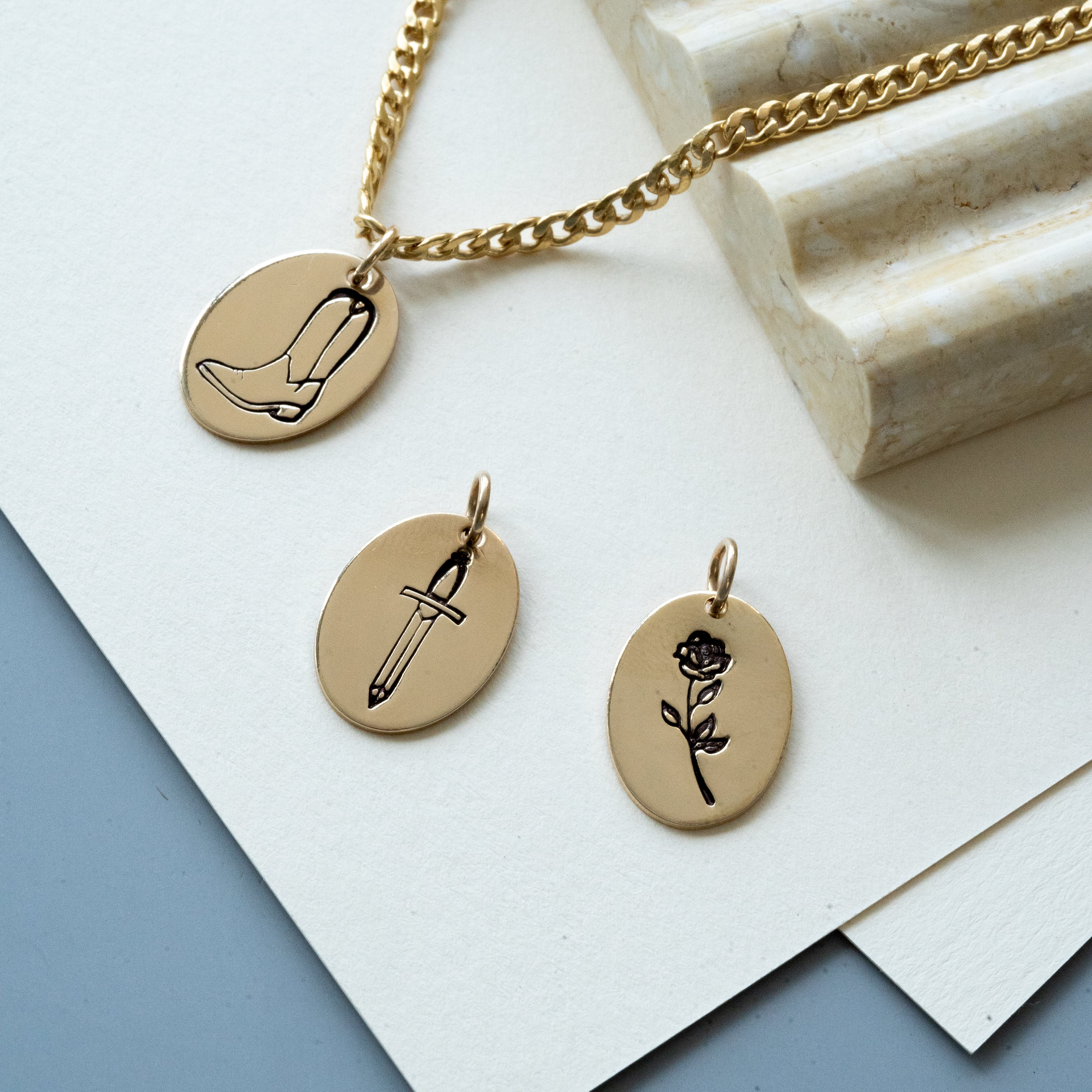You thought we were only about the delicate and dainty when it comes to necklaces, surprise! Our Dagger necklace set on our newest 3mm curb chain is the perfect statement piece to be worn with your other favourite necklaces. Capable of being switched out with other pendants, this curb chain and charm set are available in Sterling Silver and Gold Fill.